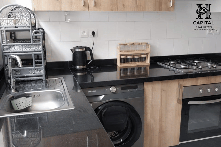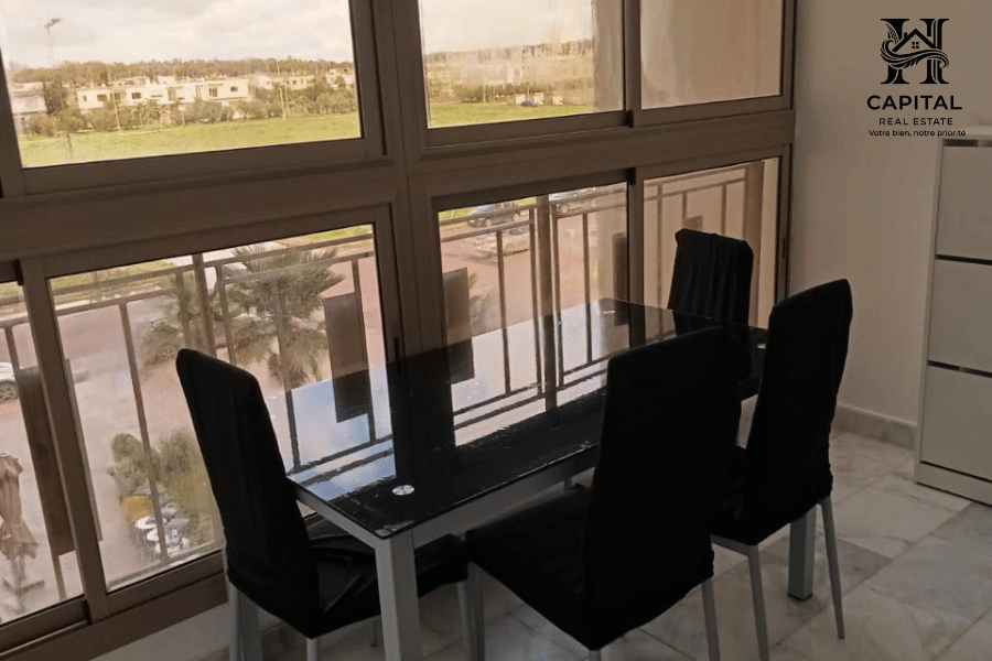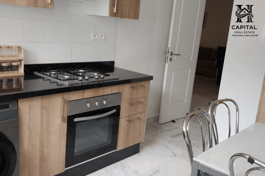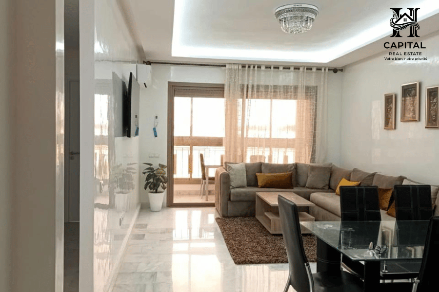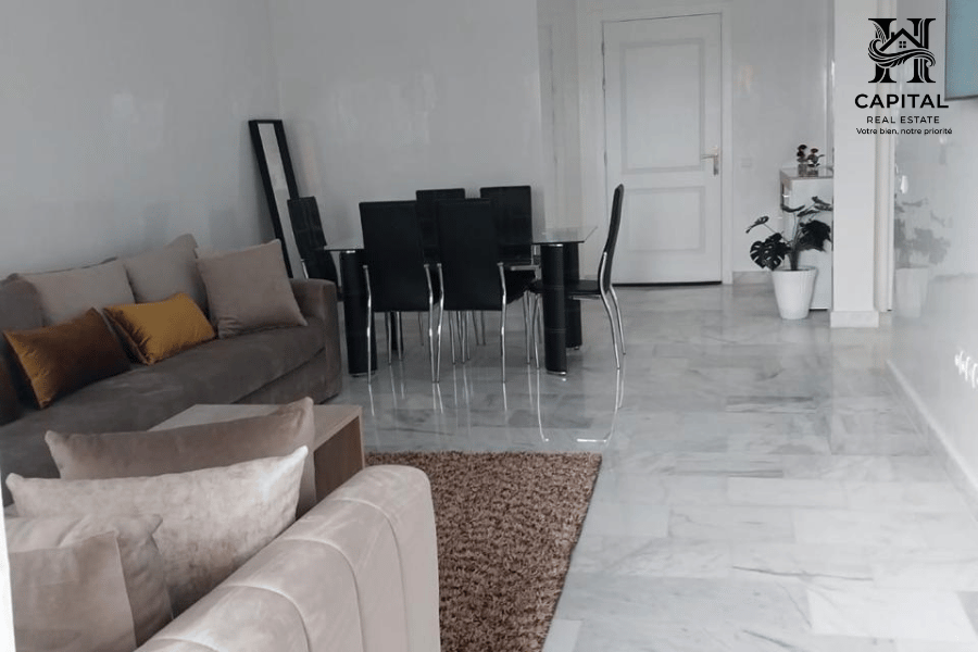 À Casablanca, cet appartement meublé offre un cadre de vie confortable et fonctionnel, idéal pour une location mensuelle. Les espaces sont bien agencés avec un salon lumineux ouvrant sur un balcon, un coin salle à manger convivial et une cuisine équipée avec rangements et électroménager intégrés. La partie nuit propose des chambres soignées avec literie confortable et rangements, ainsi que des salles d’eau modernes. Les finitions en marbre, la climatisation visible et la décoration épurée apportent une atmosphère agréable, adaptée aux séjours professionnels ou longue durée.