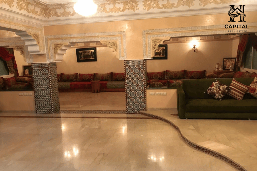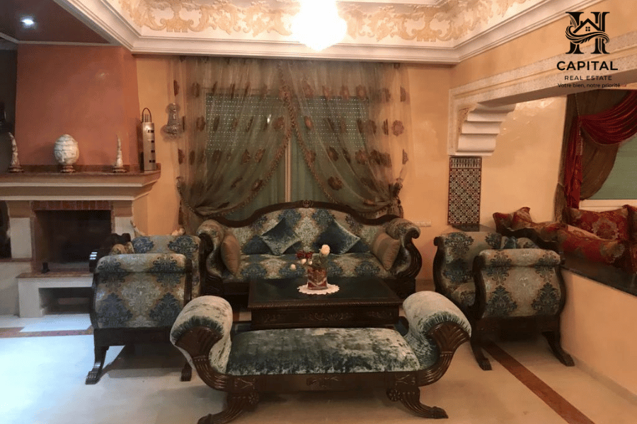 Proposée à la vente dans le secteur Villas, cette villa se distingue par sa façade soignée, son jardin arboré et sa piscine privative. Les photos révèlent de généreux espaces de réception, avec plusieurs salons, des finitions décoratives d’inspiration marocaine, une cheminée et une belle hauteur visuelle. La cuisine, spacieuse et fonctionnelle, offre un important linéaire de travail, tandis que les salles d’eau bénéficient d’un volume confortable et de lumière naturelle. Un bien de caractère, adapté à une vie familiale ou à une résidence de standing.